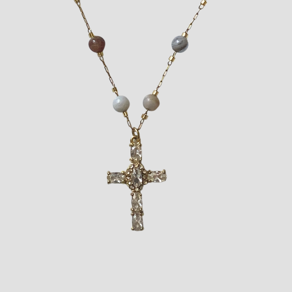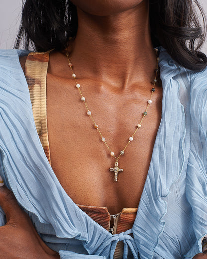Beautiful cubic zirconia cross design featuring multi color bead necklace.