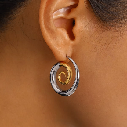 The 2-Tone Swirl Hoop Earrings are a modern twist on a timeless classic. Featuring a striking blend of 18k gold and sleek stainless steel, these hoops boast a unique swirl design that adds dynamic movement and dimension. The two-tone finish creates a bold contrast, making them versatile enough to pair with any outfit, from casual to chic.