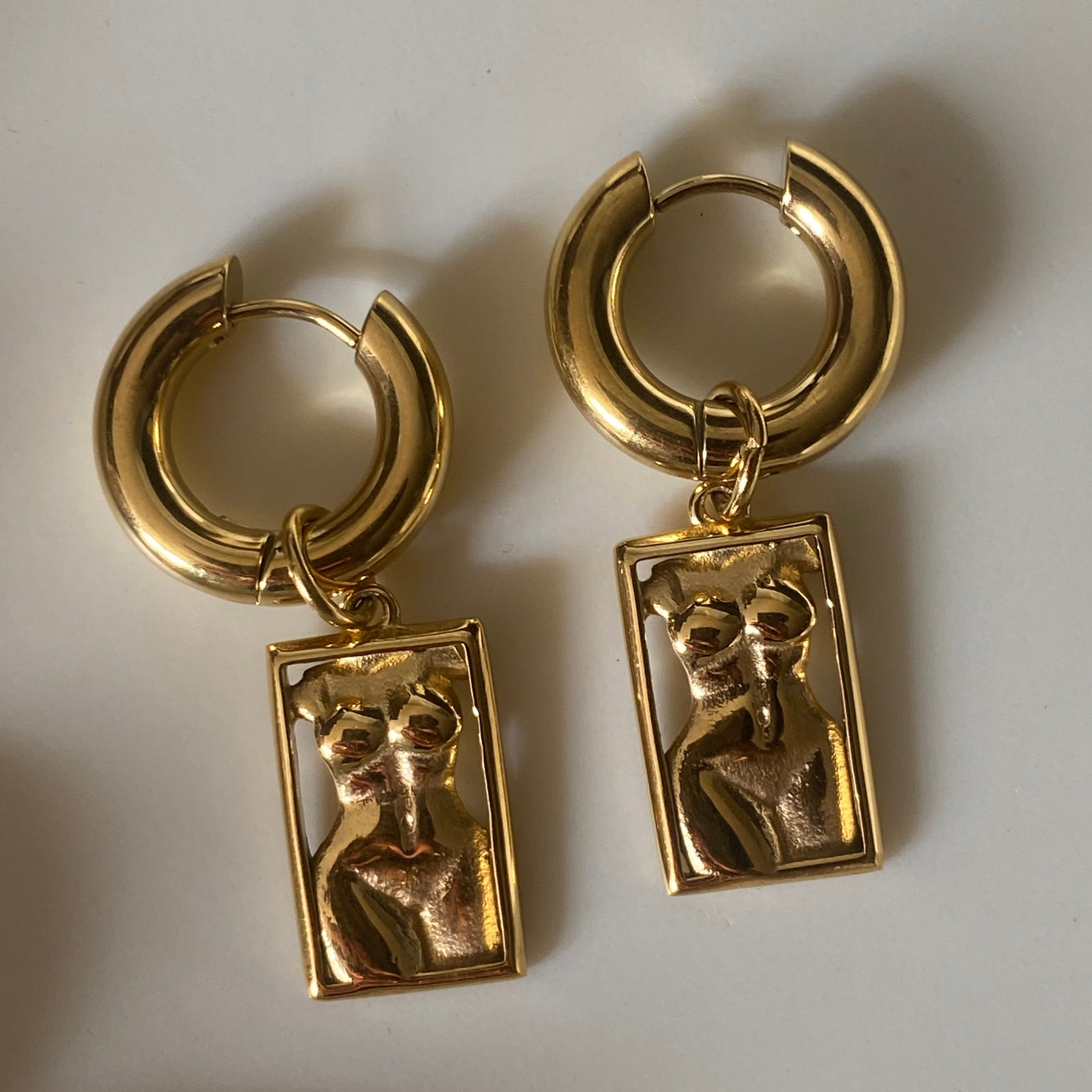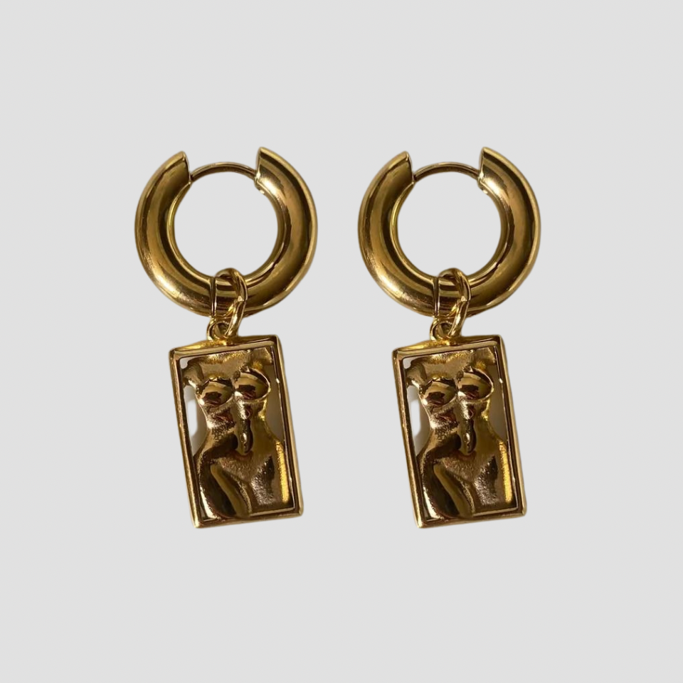 The Cuerpo Dangle 18k Gold Earrings are a striking and artistic expression of modern elegance. Featuring a delicate yet bold female body form pendant, these earrings are crafted from radiant 18k gold, suspended from a fine chain that allows them to move gracefully with every turn.