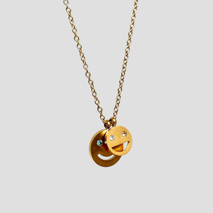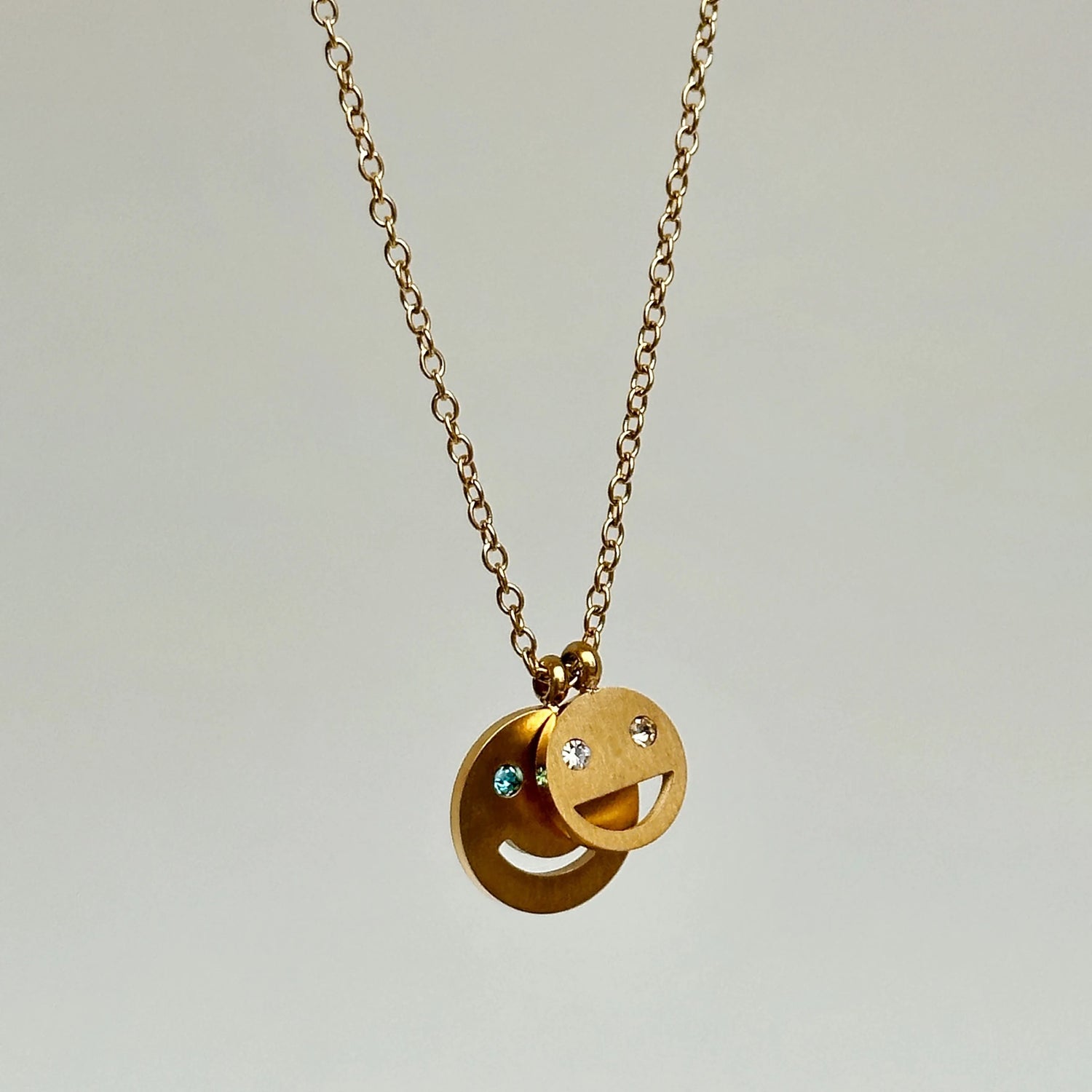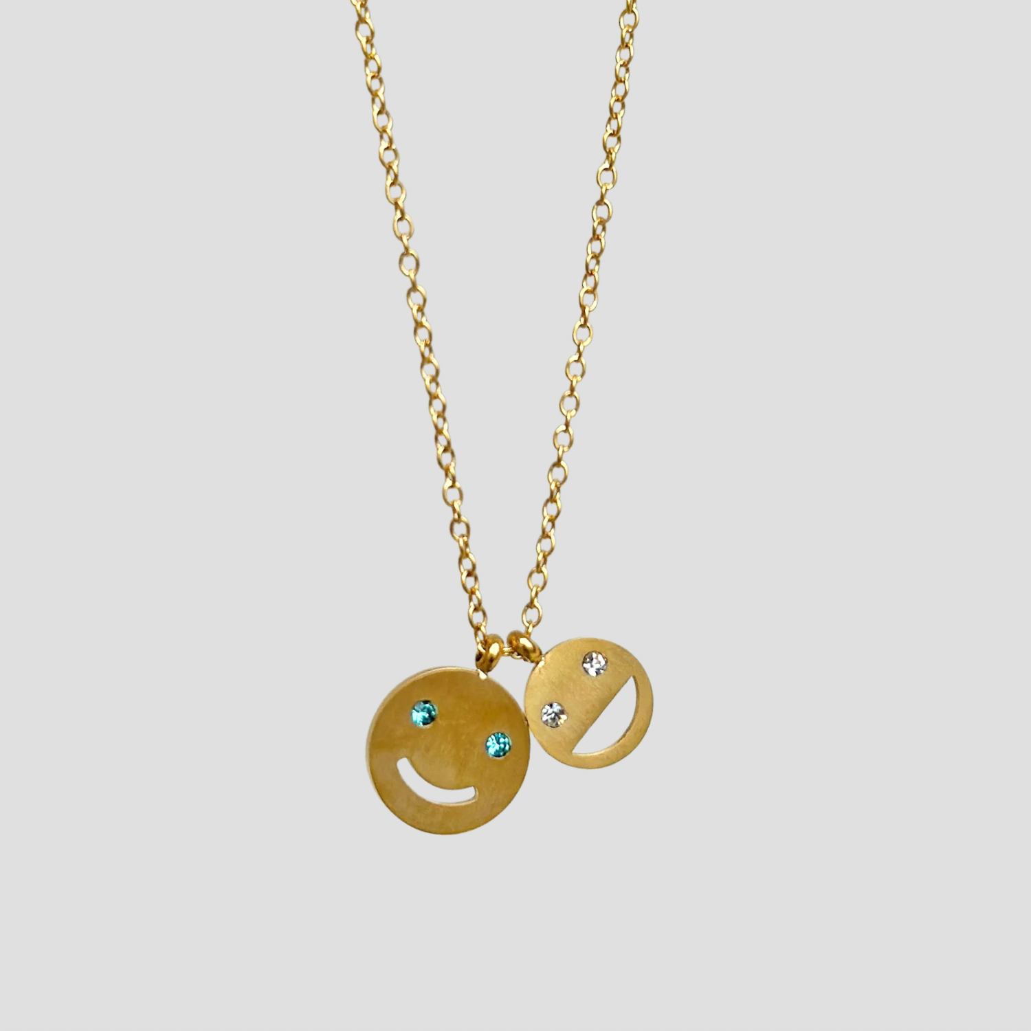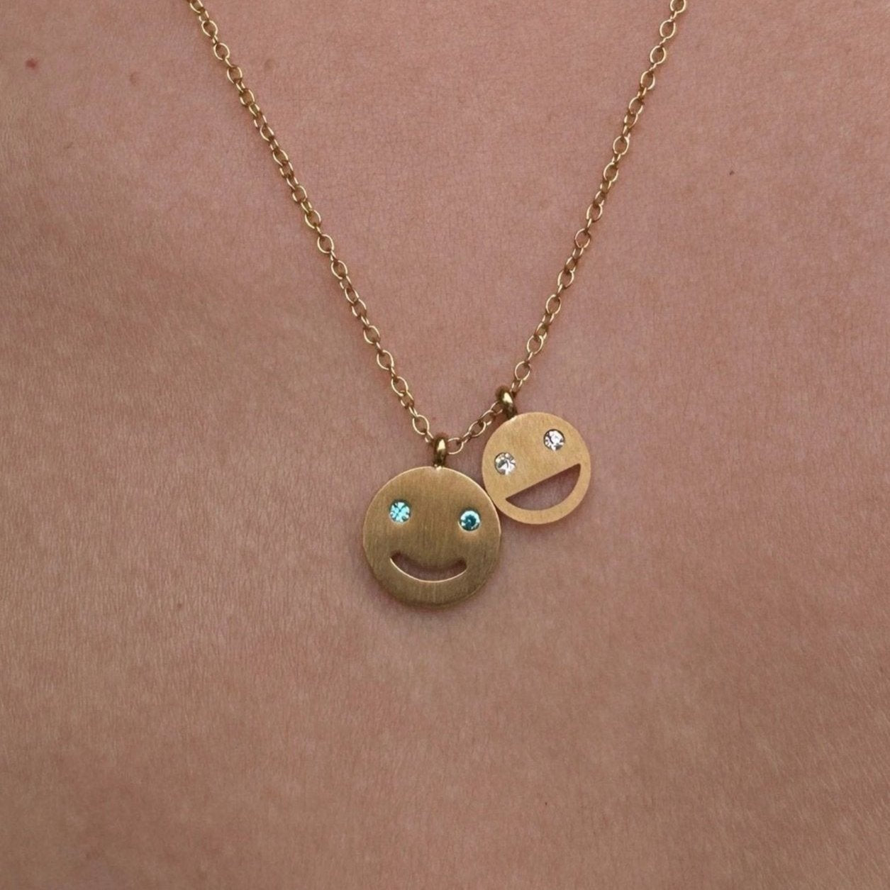 The Smiley 18k Gold Necklace is a playful twist on luxe minimalism. Crafted in radiant 18k gold, this sleek chain features not one but two chic smiley charms accented with vibrant blue and white gemstones, doubling the fun while keeping it effortlessly stylish.