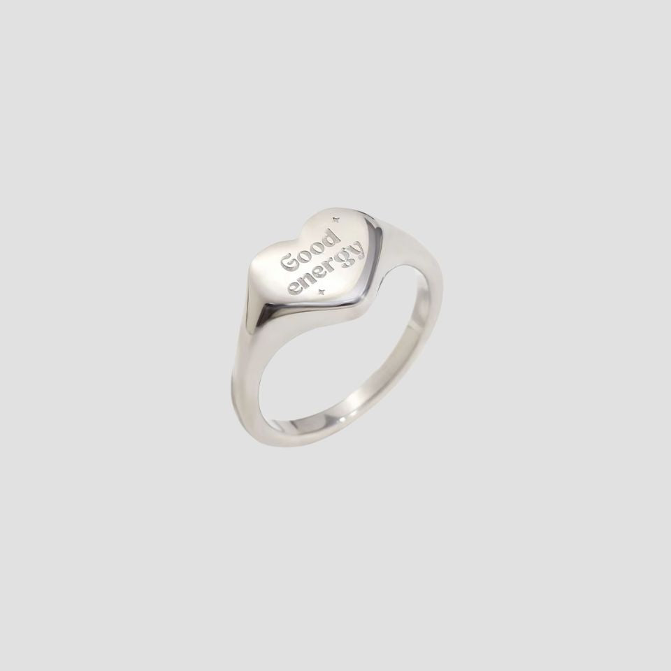 The 'Good Energy' Signet Steel Ring is a polished power piece that speaks volumes. Crafted from sleek stainless steel, its bold design features the uplifting "Good Energy" etching, turning a classic signet into a modern mantra.