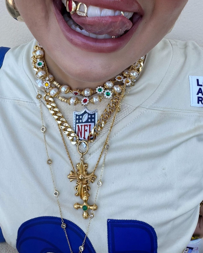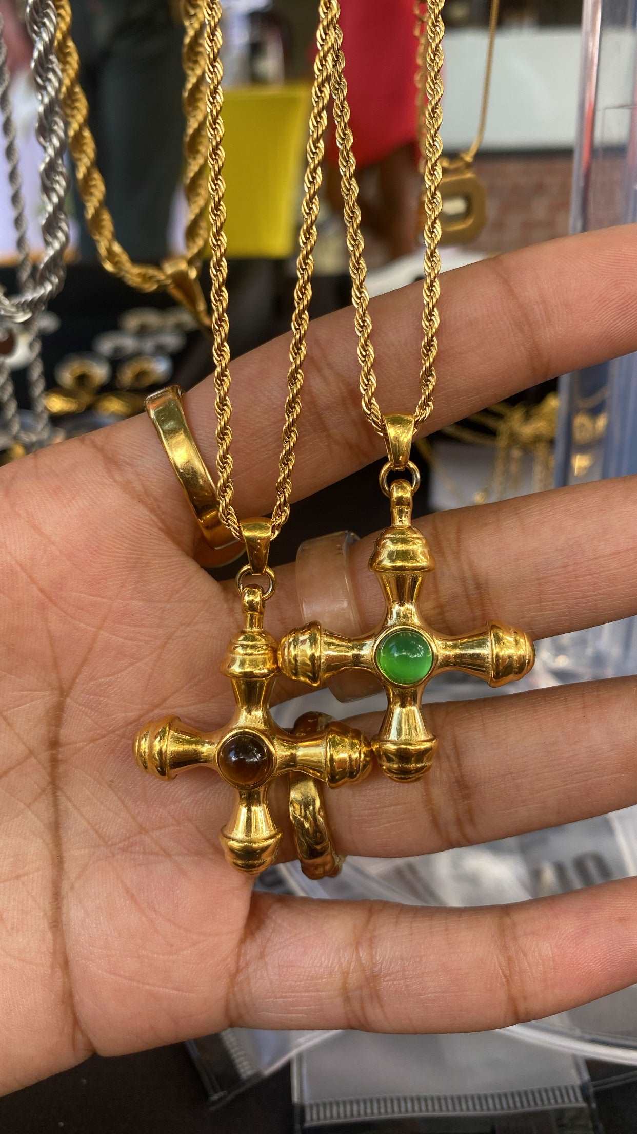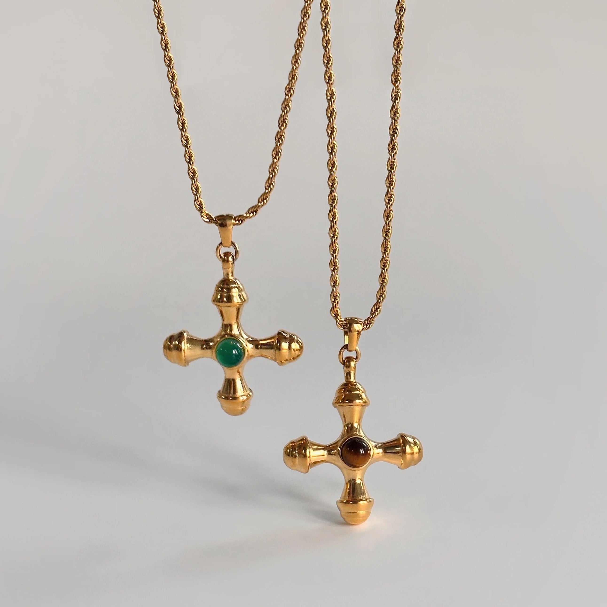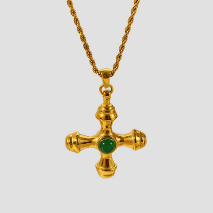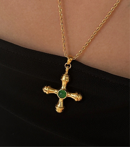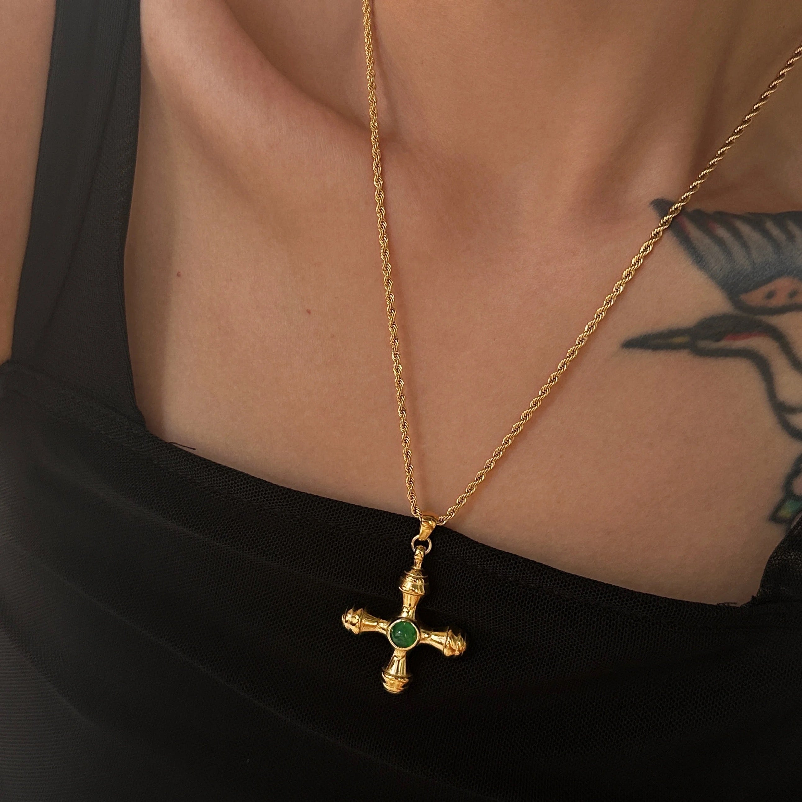 Green Agate 18k Gold Cross Pendant Rope Chain Necklace