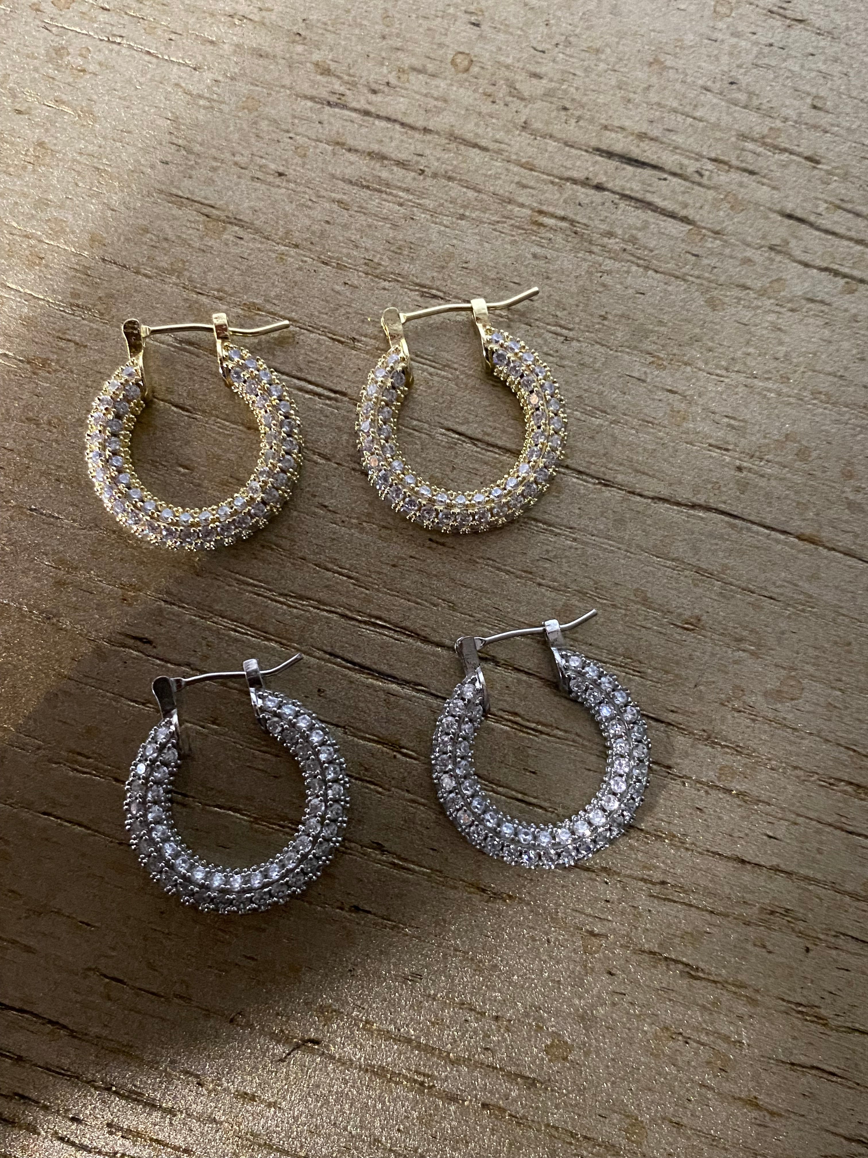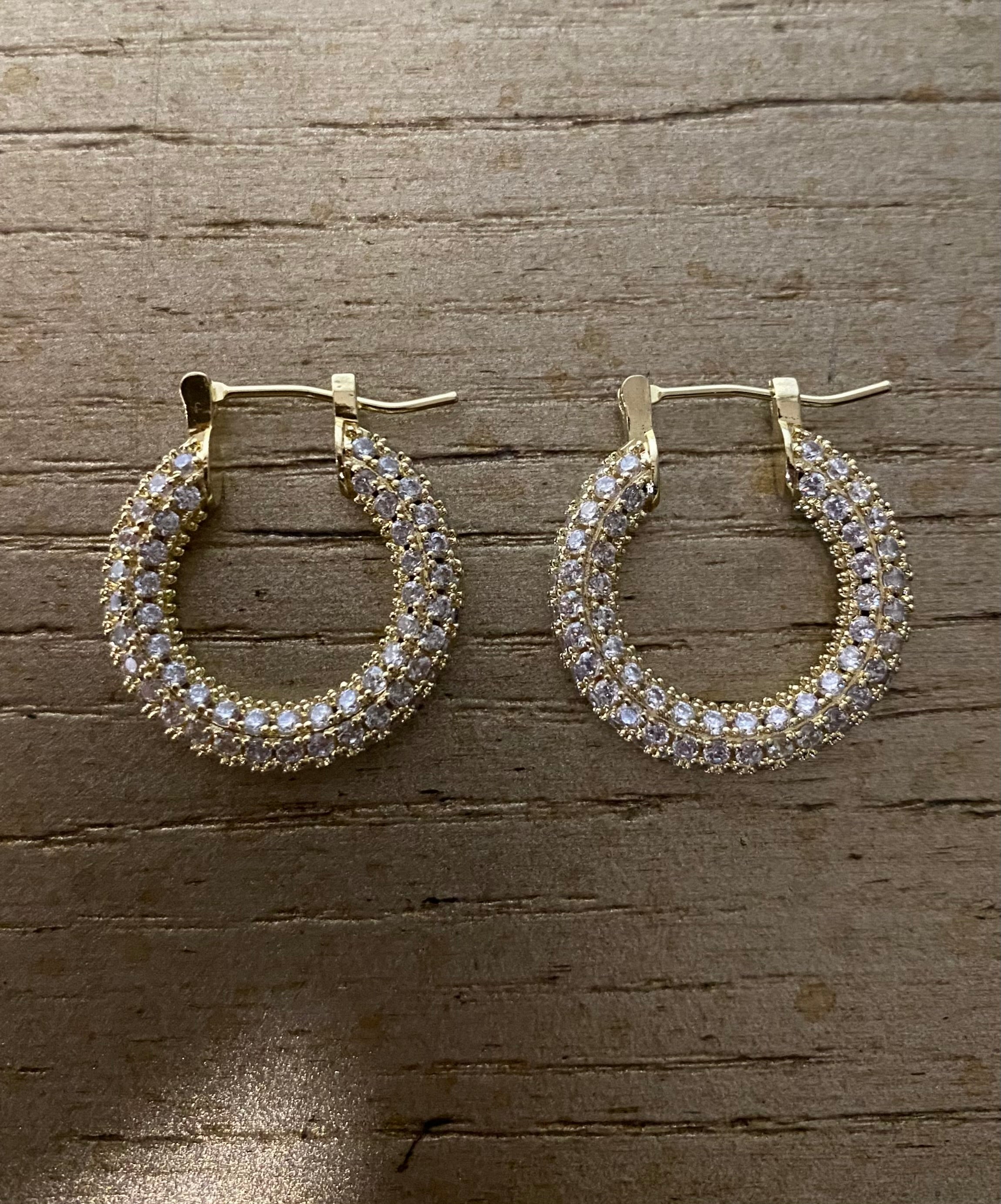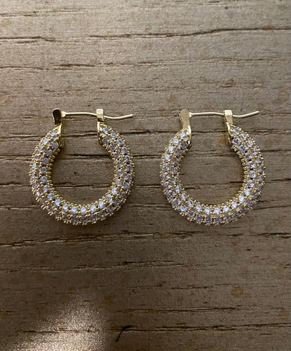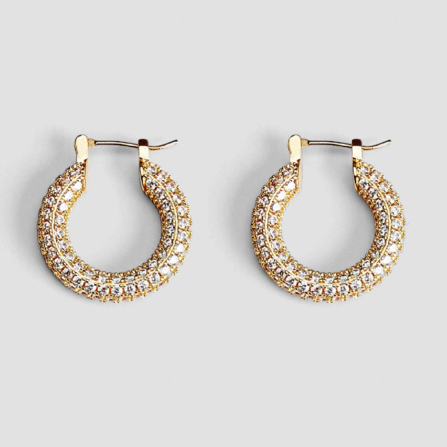 Our Iced Gold Pavé Medium Hoop Earrings stand out with a unique iced gold pave design, featuring intricate Pavé Cubic Zirconia stones that sparkle brilliantly, ensuring you turn heads wherever you go.