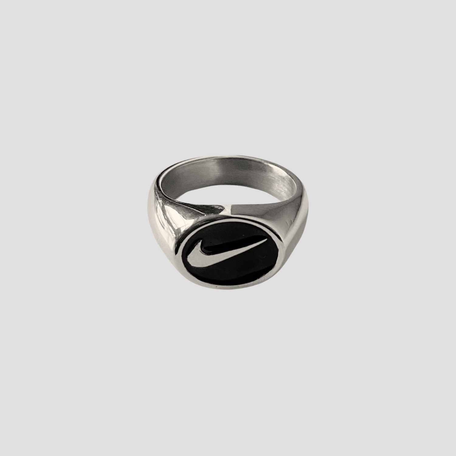 The Just Do It Stainless Steel Oval Ring in Black Enamel is a bold and playful statement piece. Crafted from durable stainless steel, this ring features a sleek rectangular face, adorned with a black enamel inlay that adds a pop of boldness.