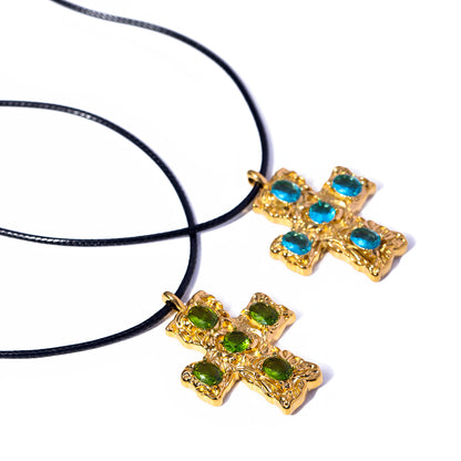 Rugged 18k gold plated cross pendant design featuring cerulean blue gemstones on a black leather chain.